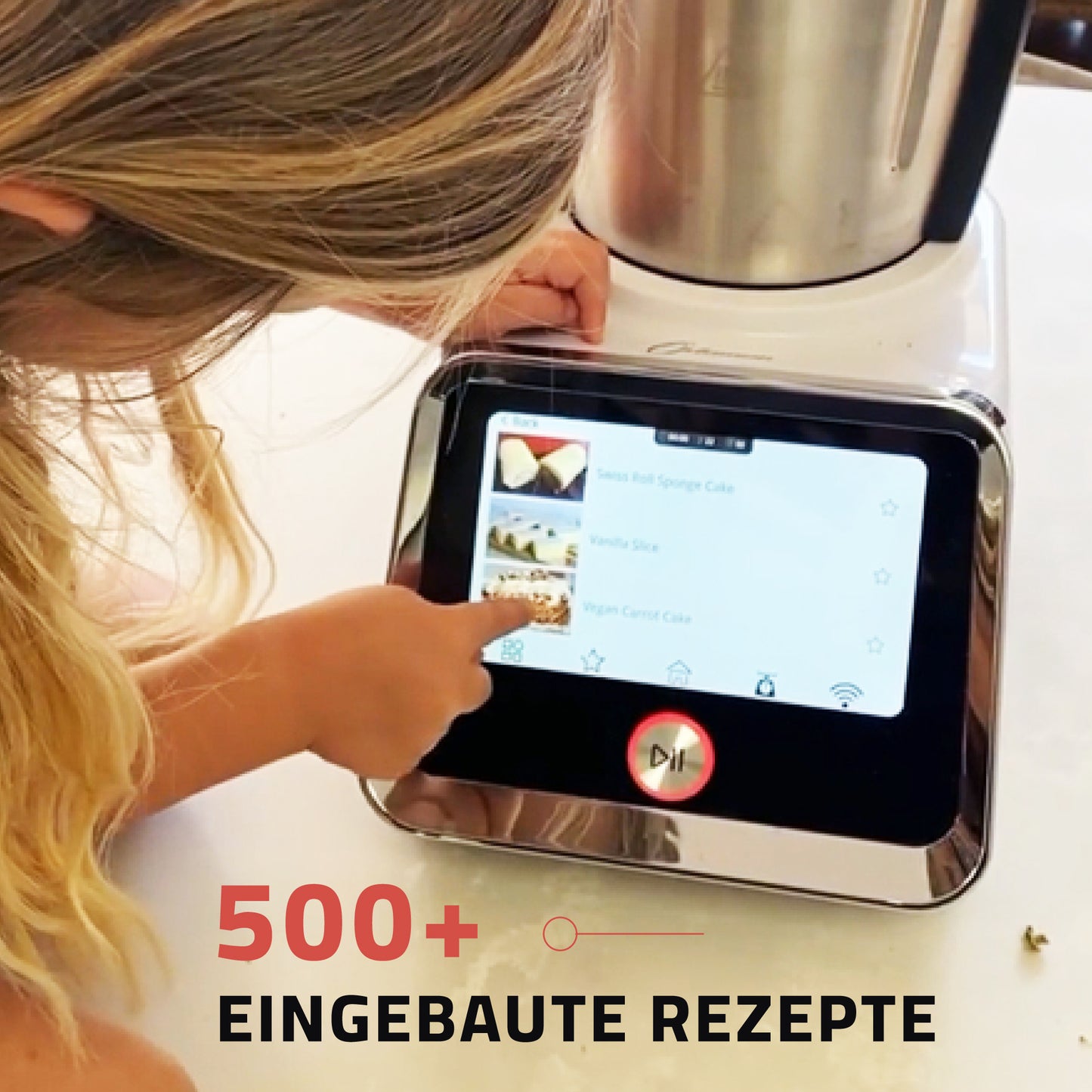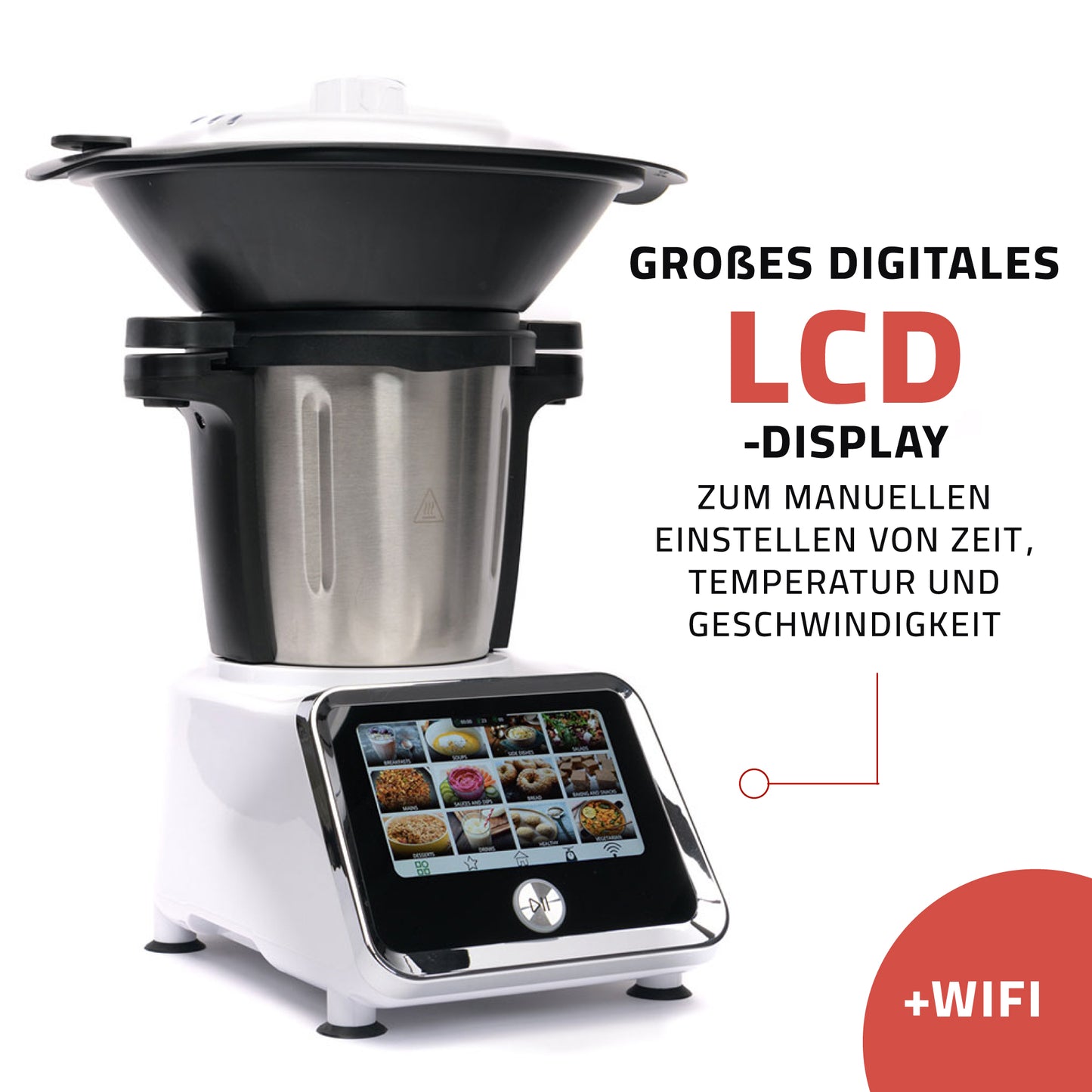 Large digital LCD display for manual input of time, temperature and speed. 5 preset programs for cooking jam, steaming, soups and 2 dough kneading programs. Counterclockwise rotation (reverse), pre-programmed recipes, WIFI and the option to save your own recipes in a cell phone app for more flexibility.
