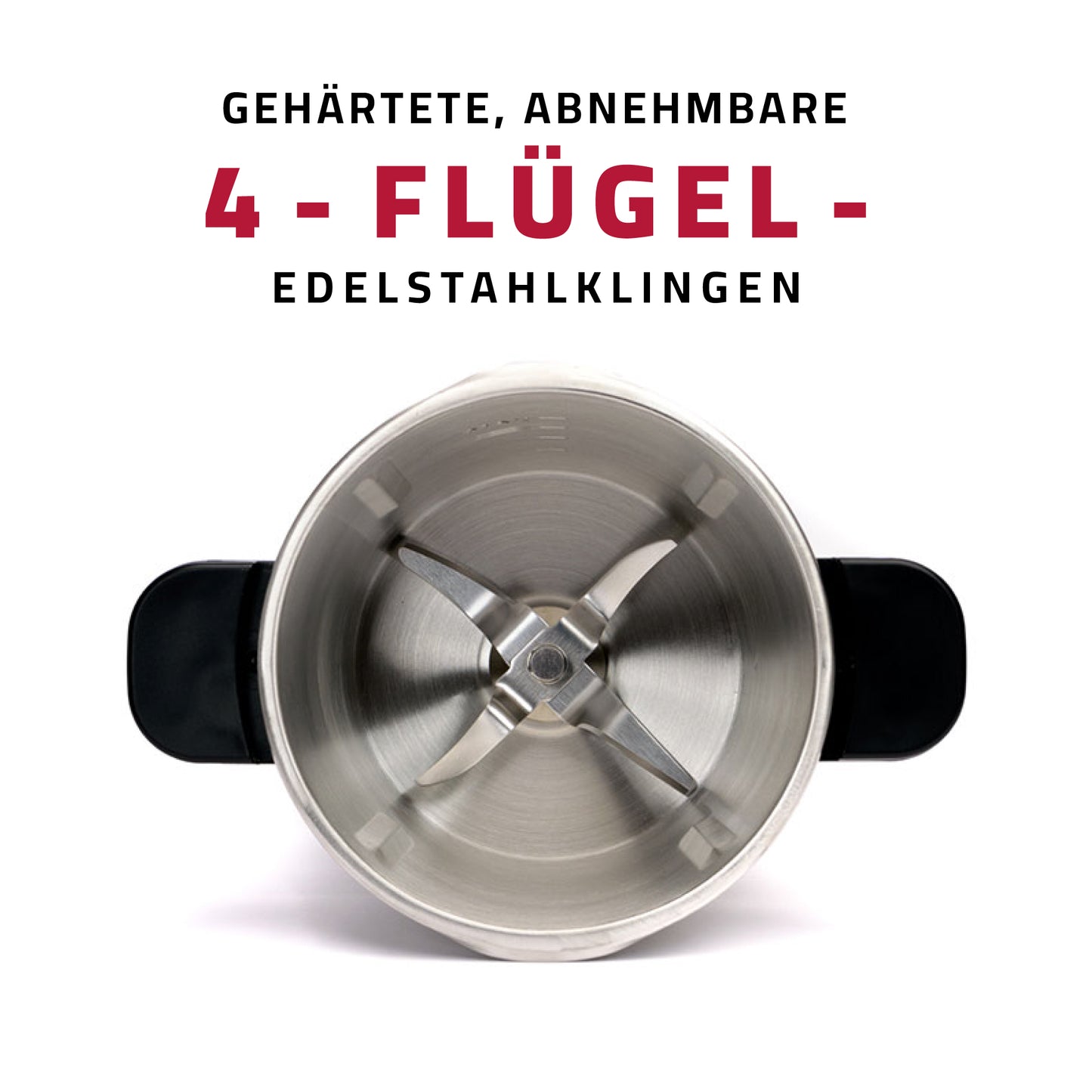 | Messer/Klingen: | Gehärtete, abnehmbare 4-Flügel-Edelstahlklingen |