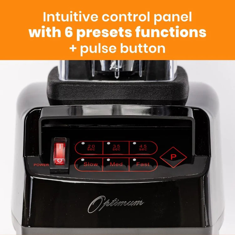 The Optimum is equipped with a self-compensating energy-efficient motor that can reach an output of 2,611 watts and a top speed of up to . The free-form forged stainless steel 6-blade insert is perfect for crushing ice in seconds to make the best smoothies and milkshakes. The motor is self-compensating, resulting in reduced power consumption and allowing the Vortex blender to withstand heavy use in cafes and juice bars. To protect the motor from overheating, the Optimum is equipped with a shut-off button, ideal for juice bars looking for a long-lasting reliable Vortex blender.