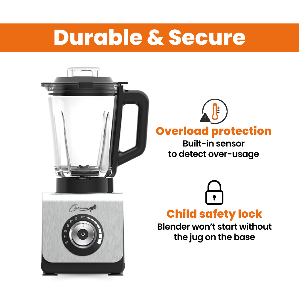 Child Safety LockFeaturing a child safety start feature, the Optimum 9400 Essential smoothie drink maker prioritizes safety and peace of mind. Designed to safeguard households with children, this feature guarantees the blender won’t start unless the jug is securely positioned on the base. | |