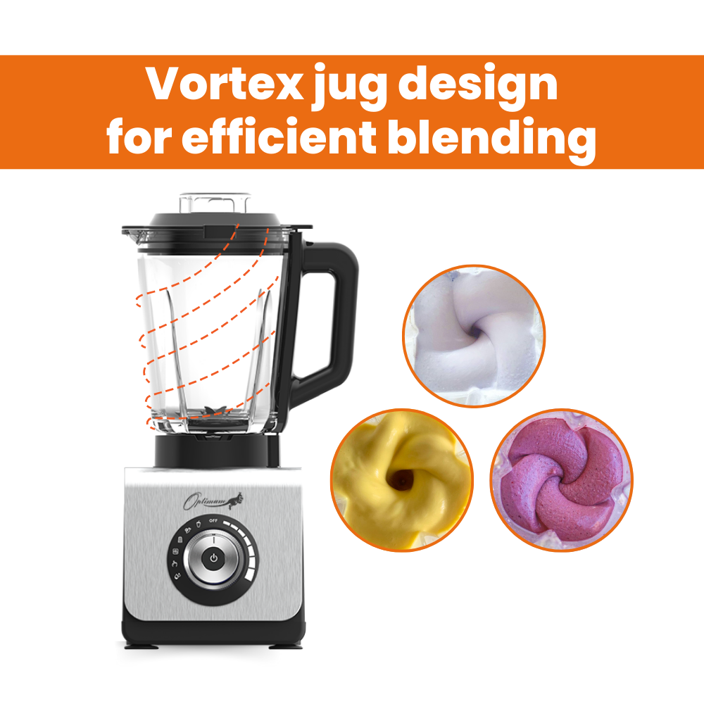 Vortex Jug DesignsImmerse yourself in exceptional blending performance with the Optimum 9400 Essential’s innovative glass vortex jug design, which moves ingredients towards the blades. This process seamlessly cuts and mixes ingredients to achieve smooth consistency every time. | |